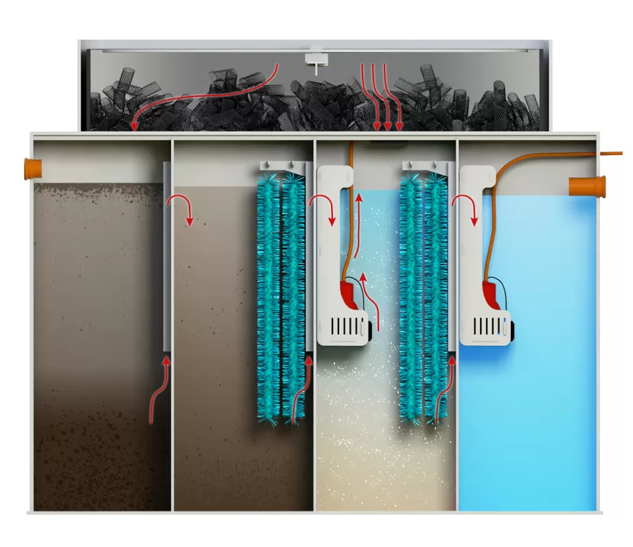 - 3-я камера тоже имеет ершевидную загрузку. Здесь же установлен насос для рециркуляции воды.